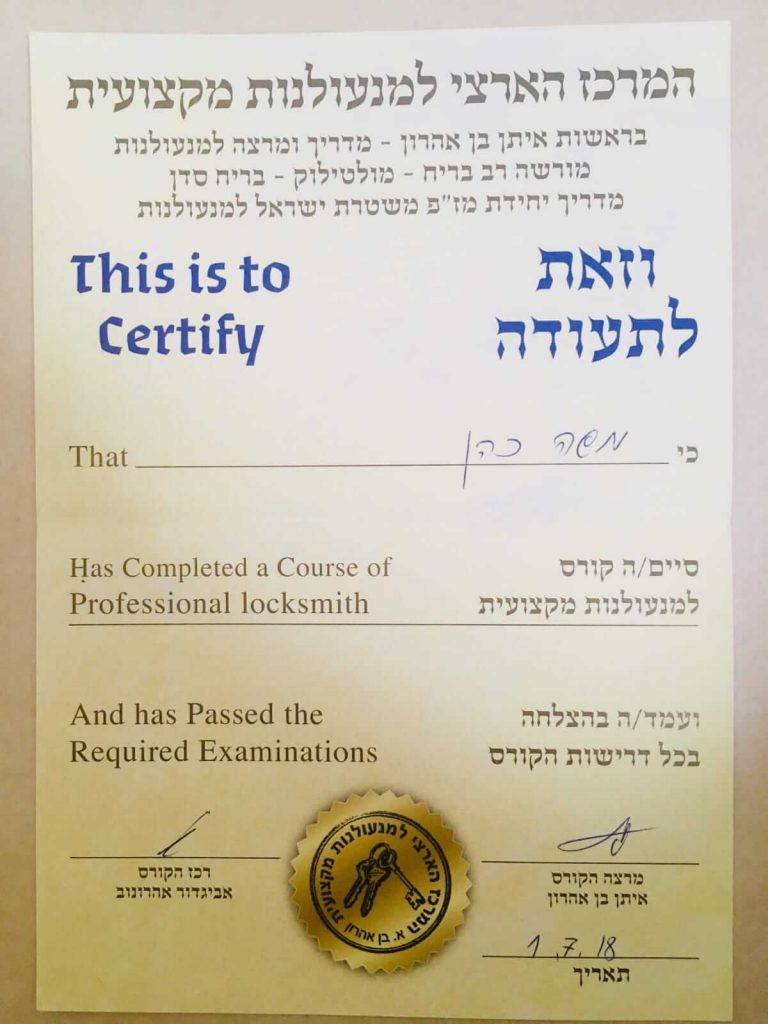 קצת עליי, אני בוגר קורס מנעולנות מקצועי מטעם המרכז למנעולנות אור עקיבא, במהלך הקורס הצטיינתי בכל התחומים שנלמדו, מאז שסיימתי את הקורס צברתי ניסיון מעשי בשטח במשך 3 שנים ועבדתי עם קהל רחב מאוד ומגוון כך שאפשר לומר שראיתי ופתרתי את רוב סוגי התקלות בתחום.